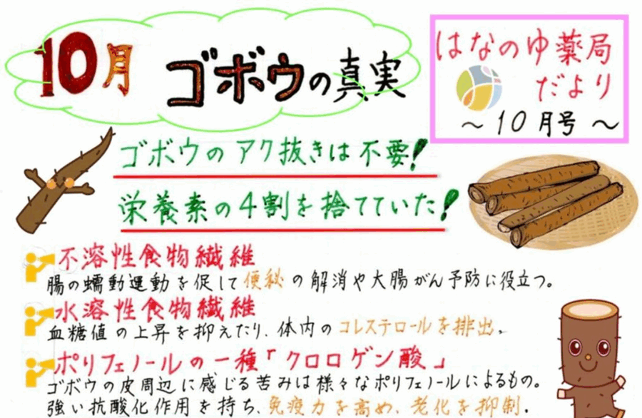 今月のはなのゆ薬局たよりはごぼうの真実について掲載しています。 皮むきなし、あく抜きなしでのずぼら料理で倍特をする!下ゆではなし!電子レンジで栄養素アップ!生...